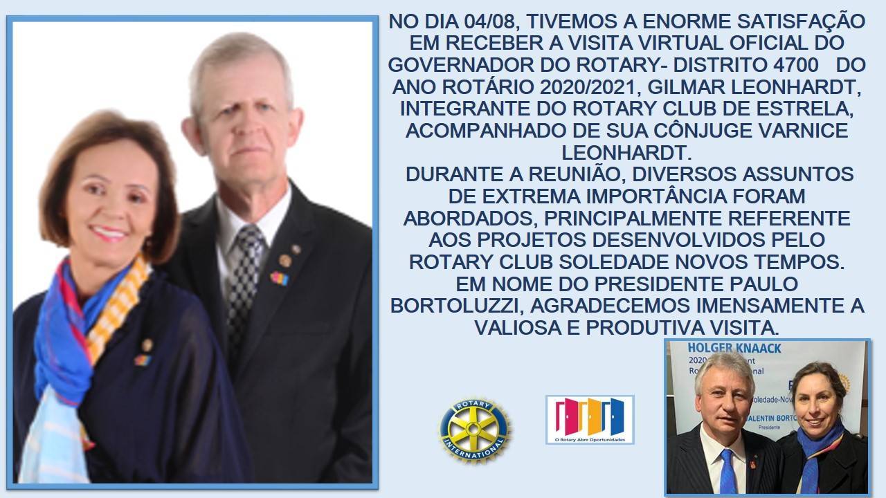 O ROTARY CLUB DE SOLEDADE NOVOS TEMPOS TEVE A HONROSA VISITA OFICIAL VIRTUAL, DO GOVERNADOR GILMAR LEONHARDT E CÔNJUGE VARNICE LEONHARDT. EM NOME DO PRESIDENTE PAULO VALENTIN BORTOLUZZI, AGRADECEMOS IMENSANTE A ATENÇÃO DO REFERIDO GOVERNADOR.