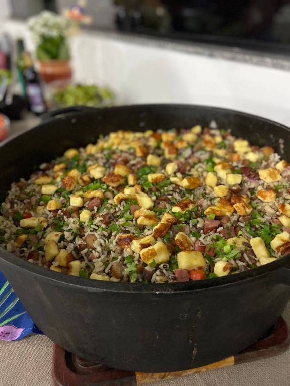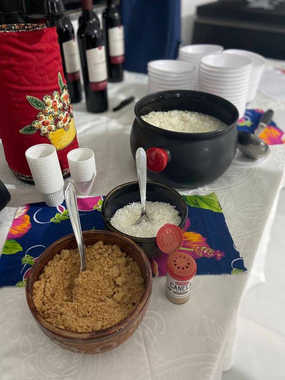 O prato principal foi uma releitura do famoso Baião de Dois, mas com um ingrediente especial: o pinhão. Passando a se chamar então de Baião de Dois Gaúcho. Para completar, a sobremesa foi uma deliciosa Canjica!