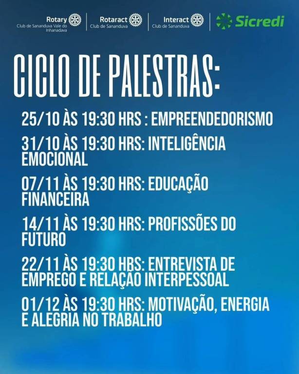 O Rotary Club de Sananduva Vale do Inhandava, em parceria com Sicredi, Rotaract e Interact de Sananduva, realizou o ciclo de palestras 06 Degraus para o Sucesso Profissional. Em cada semana, um assunto era abaordado, tendo como público alvo os estudantes do ensino médio.